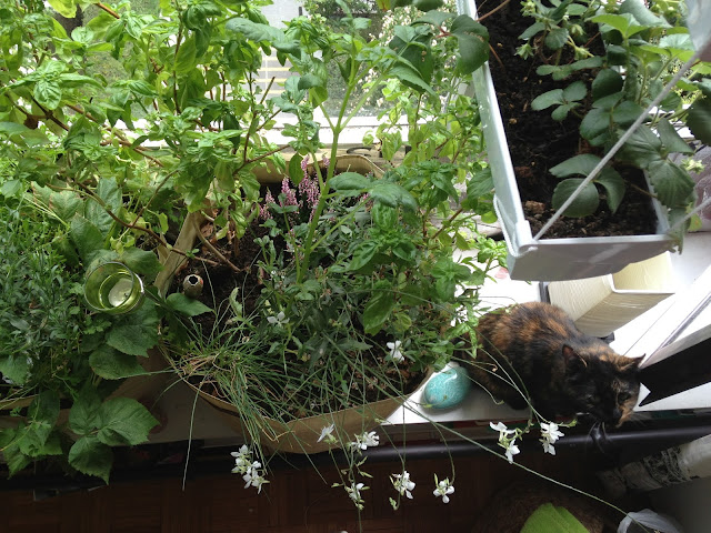 Petit à petit je plante aussi au potager des plantes de jardin rustiques et belles, qui supportent la sécheresse et la grosse chaleur car d'une part j'ai envie de mélanger plantes d'ornement, plantes à fleurs et plantes gourmandes (comprenez potagères !) et d'autre part il fait tellement chaud derrière ma fenêtre qu'il faut des plantes adaptées ! Alors je fais des essais, je verrai bien ce qui pousse bien en intérieur. Ce qui attise grandement la curiosité de mes voisins ! "Un jardin dans votre appartement ??", "c'est pour mettre à l'intérieur ces jolies fleurs ??"